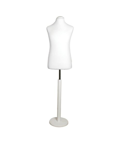 Hvid Treviso unisex barnegine størrelse 3-4 år. Den kommer med en rund hvid fod med matchende flad top. Det er muligt at justere hvor højt ginen skal stå. Ginen kommer et hvidt betræk, hvor det det er muligt at indsætte knappenåle i. Betrækket kan tages af og vaskes. Det er muligt at få denne model i 3 andre størrelser, 1 år (5301-01), 6-8 år (5321-01) og 10-12 år (5331-01). Mål: Hals omkreds: 30 cm. Hals dia. (Ø): 9,5 cm. Skulder bredde: 23 cm. Skulder omkreds: 63 cm. Bryst: 61 cm. Talje: 53 cm. Hofte: 63 cm. Ryg højde: 46 cm. Front højde: 45 cm. Fod og Top: Hvid rund fod og flad top.
