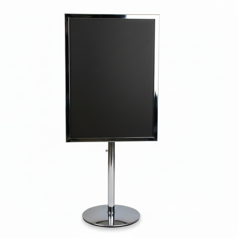 Our classic menu holder in metal on a sturdy round metal base. Our menu or sign holder is suitable for any kind of signage. Whether it's a laminated sign, a sign with plastic pockets, paper or cardboard, it can be inserted into our menu holder. The base has a fixed height of 19 cm but can be extended by up to 15 cm with the purchase of an extender. We also recommend buying plastic pockets to protect the paper sign from wear and dirt. The galvanized model is especially suitable for outdoor sales counters, as it withstands various weather conditions.