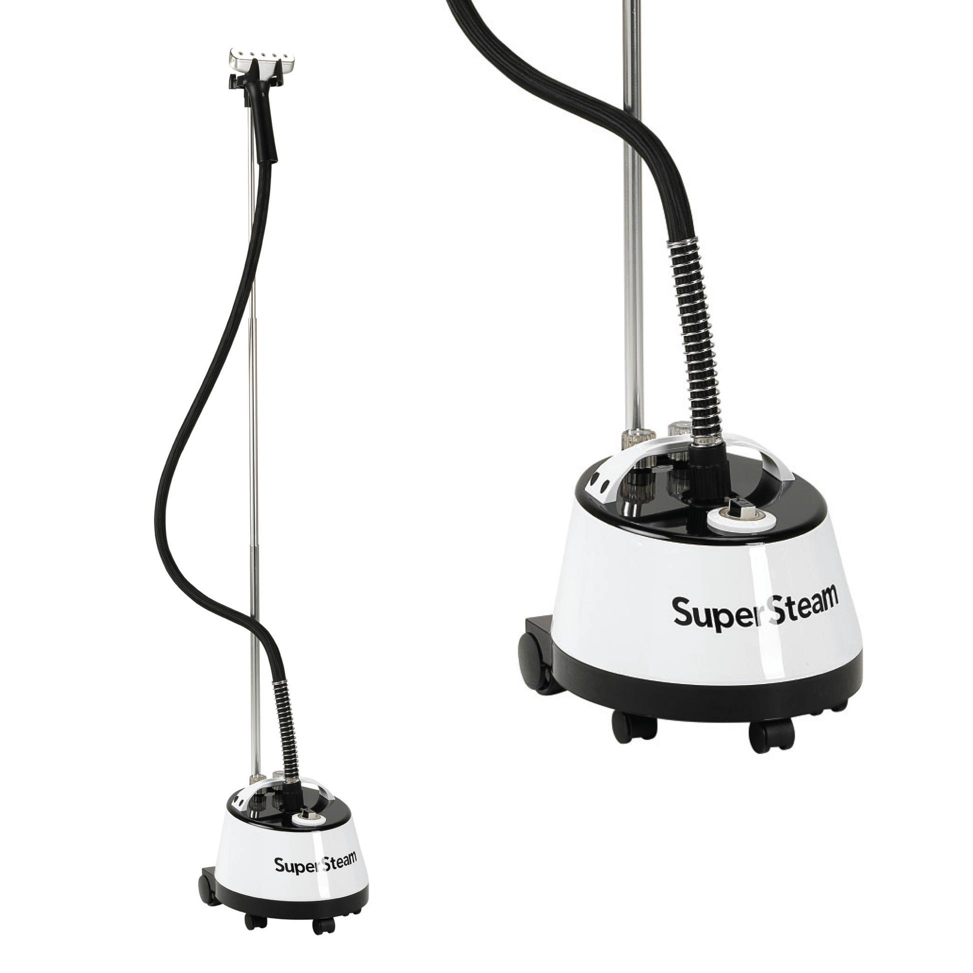 Supersteam garment steamer - For professional needs - easy operation. Up to 75 minutes of non-stop steaming. 1 speed. Ready in: 8–10 min. Metal plate on the nozzle for faster results. The water tank is integrated and all water in the tank is heated; therefore it has a longer heating time. The entire nozzle is made of metal, which provides faster and better results.