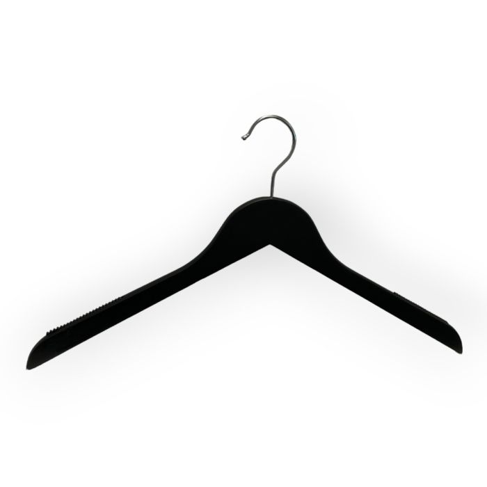 Wood hanger in matte black. Flat wooden hanger with rubber at the shoulder. Matte black with chrome hook. Measurements: 12 mm thick. 45 cm matte black. Packed in 50 pcs. Price shown per piece.