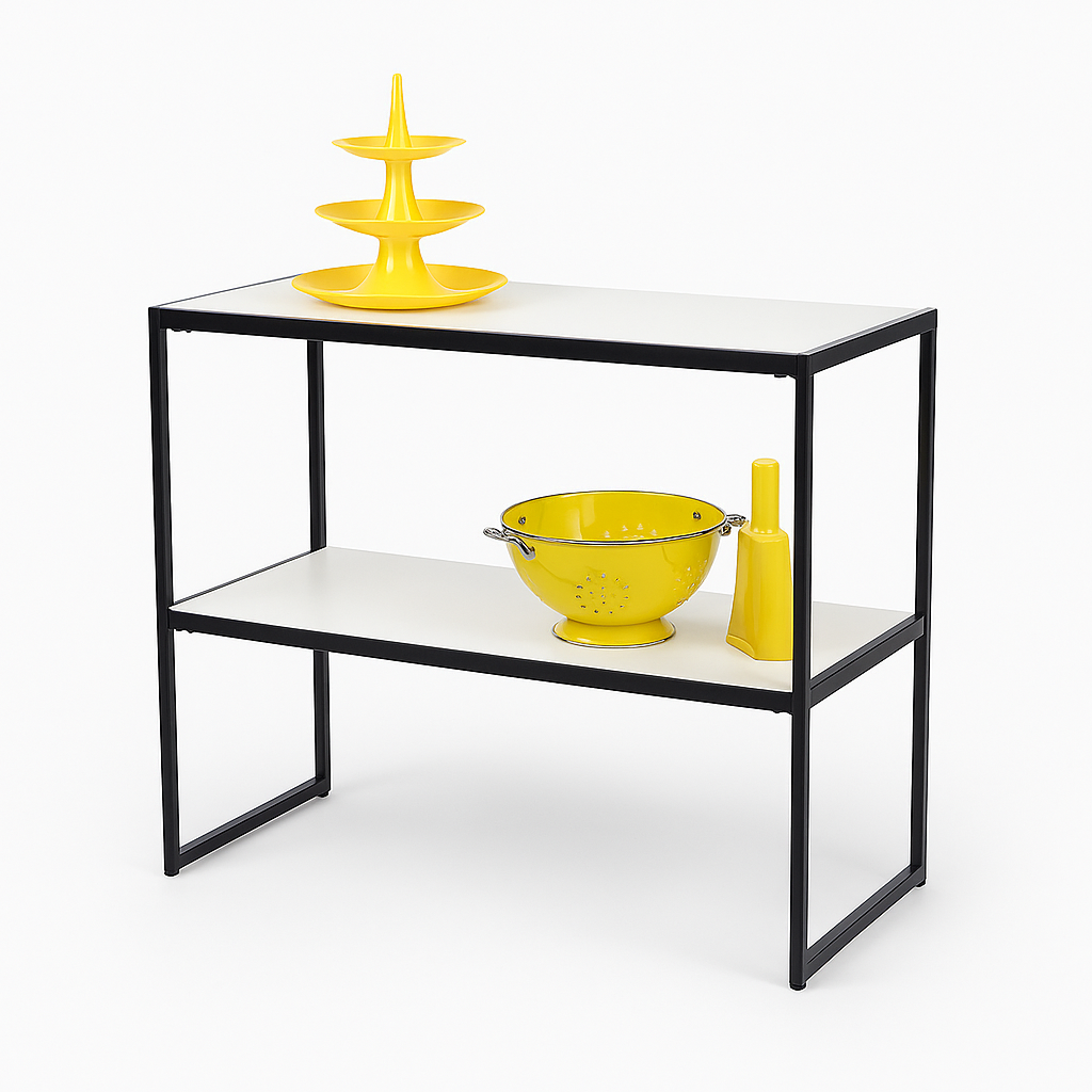 Minimalistinen muotoilu – HAPPY! myyntitiski valkoisilla melamiinipöytälevyillä. Sitä voi käyttää sekä myyntitiski että hyllynä, joten voit räätälöidä sisustuksen tarpeen mukaan ja optimoida myymälätilan. Mitat: 40 x 94 x K 82 cm Runkorakenne: Musta metalli, pöytälevyt valkoiset