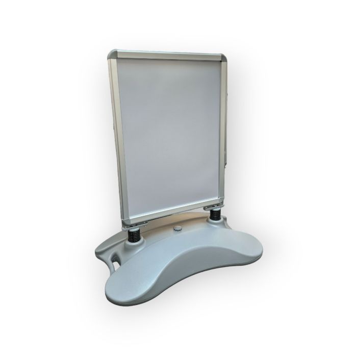 Stormmaster gøtuplakatstavlar til plakettir í støddini 50 x 70 cm. Serstakt við hesum gøtuplakatstavi er, at rammuna er fest við fjørur. Hesir fjørur tryggja neyðugu fleksibilitetina hjá skiltinum, serliga tá vindur er, og fóturin er gjørdur av slagsterkum plasti og kann fyllast við vatni ella sandi. Fyribyrging móti frostskaða: fóturin kann eisini fyllast við frostvætu, ið forðar vatninum at frysta. Eitt tvey hjól eru á skilti og við handtakinum kann tú luta tað og lættliga flyta tað eftir tørvi. Tvørrefleksfríar PET-plátur fylgja við. Skiltið verður útgjørt við snaprammum, sum gera tað skjótt og lætt at skifta plakettir. Hornini eru vard við sterkum plasthornum, sum eisini gevur rammuni eina vakra fullførd. Mál: H 98 x 81 x 51 cm, inkl. handtak. Plakettmál 50 x 70 cm. Alufargað / grá. Nýggjar PET-plátur kunnu keypast við vørunr.: 6998-00