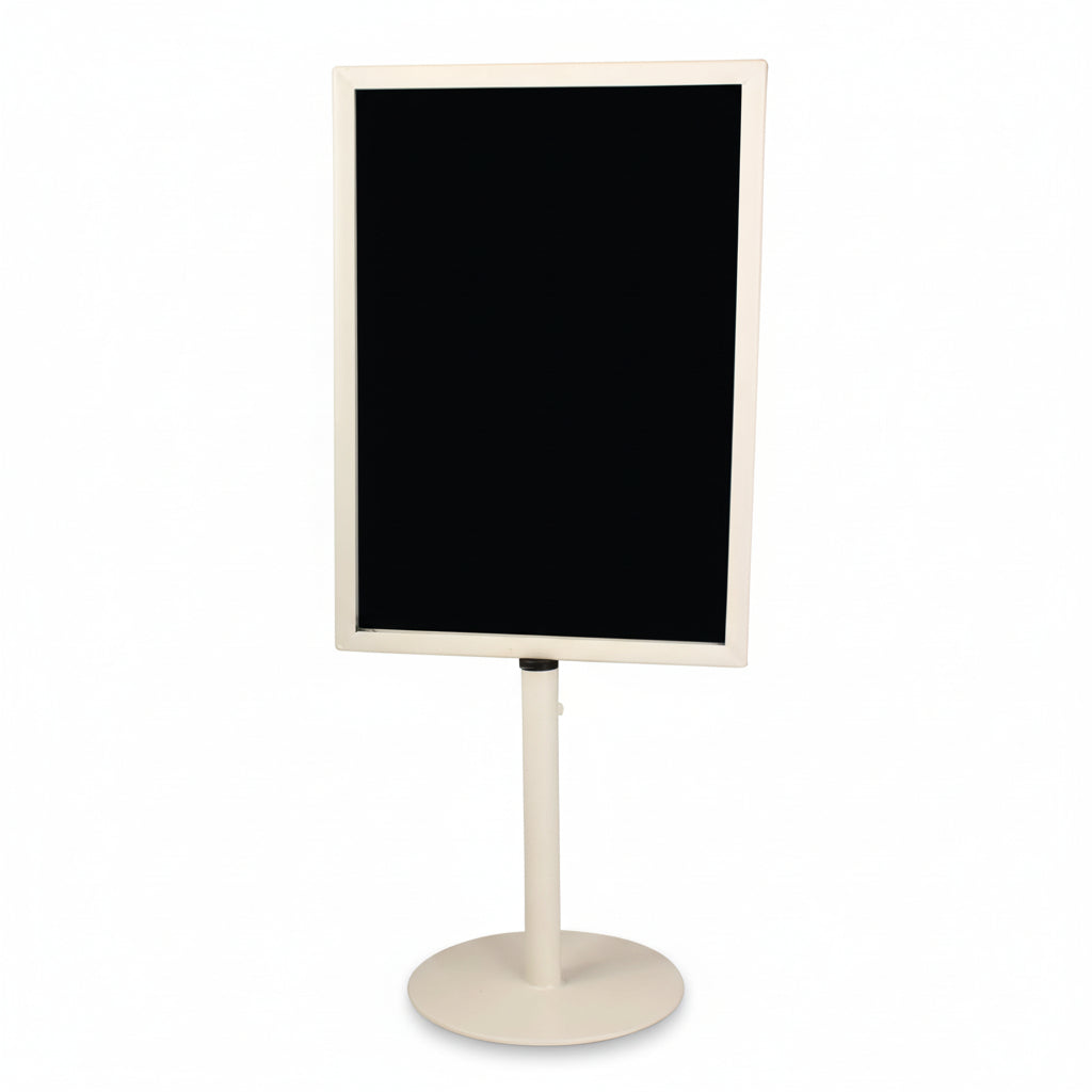 Vár klassiska matskráhaldari í metall á solidari rundari metallfót. Vár matskrá- ella skiltishaldari er hóskandi til allar hendir skiltanir. Um tað er laminerað skilt, skilt við plastlomum, pappír ella kartong, kann tað setast í okkara matskráhaldara. Fótið hevur eina fasta hædd uppá 19 cm, men tað kann hækkast við inntil 15 cm við keypi av eini forlenging. Vit mæla eisini til at keypa plastlomur fyri at verja pappírskiltið móti slitningi og nógvum óró. Tann galvaniseraða modellin er serliga hóskandi til útandura søluborð, har hon tolin ymiskt veðurlag.