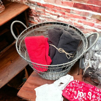 Metall trådkarv við handtaki. Vakurt til vørur á gólvi ella hillum. Ø 40 cm.