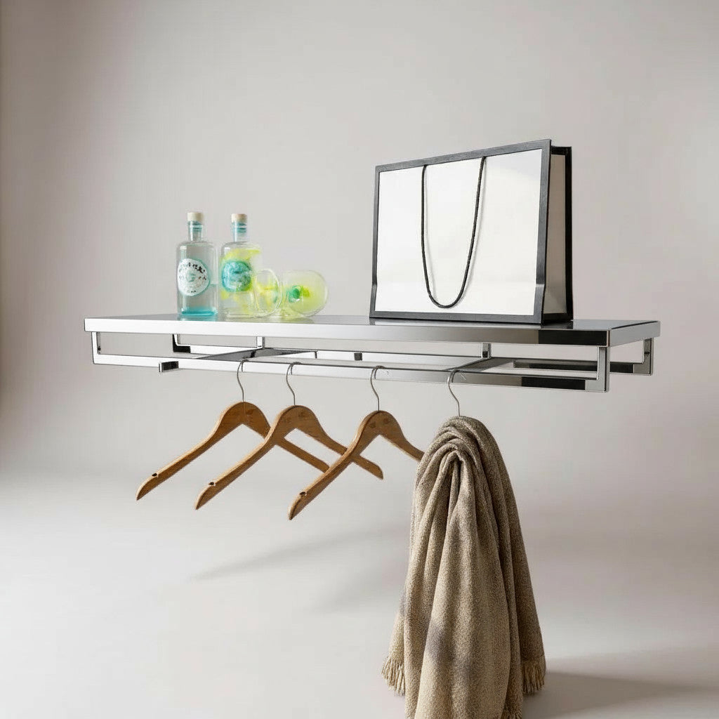 Heilt hilluker kerfi við herðastong og tveimum fastfestum framhengjum. Við frostaðari glerhillu. Sýnir hengdu fötin þín á stílháan og nútímalegan hátt með öllu hillukerfinu okkar í krómgrind. Mál: B 120 x D 37 x H 10 cm. Hillan er til beinrar festingar á vegg. HAPPY!-serían er hönnuð til að falla að einstaka hönnunarstílum og skapa lágmælda og fallega framkomu í hvaða verslun eða heimili sem er. Notaðu HAPPY!-seríuna um allt verslunar- eða seldasvæði.