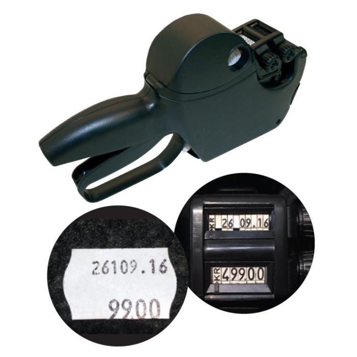 Prismærkepistol med to linjer.F.eks. til vare nr. og pris.Inkl. 4 ruller hvide prisetiketter og 1 farverulle.God startpakke.