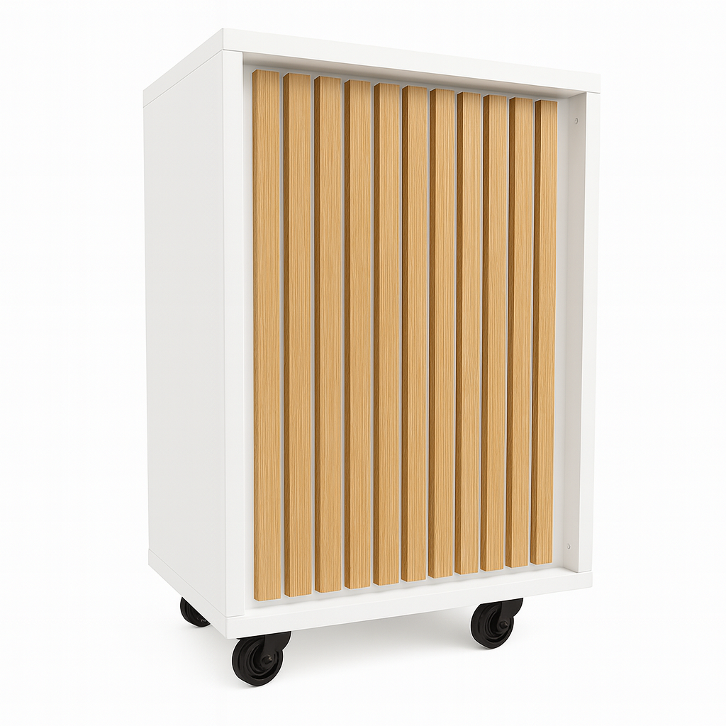 Frame-disk – smalt modul, hvid . En praktisk og lys disk. Disken er lavet i melamin med tekstur. Fronten er tilbageført, så fronten kan styles med logo, træfront eller den kan bare bruges som den er. Disken kommer indvendige hylde, der har plads til evt. ledninger. Hjul medfølger til disken. Disken kan stå alene eller bygges i vinkel/U-form. B55 x D55 x H91 cm (med hjul H93 cm)