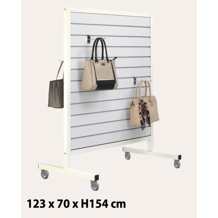 Salgsgondol med rillepanel – hvid på hvid En praktisk og stilren salgsgondol i hvidt design – med rillepanel på begge sider og solidt stålstel. Rillepanelerne gør det nemt at præsentere varer på kroge, hylder eller hyldebærere, og løsningen egner sig perfekt til midteropstillinger i butikken, hvor varerne skal være synlige fra begge sider, Ideel til præsentation af tøj, tilbehør, sko, gaveartikler, isenkram eller kampagnevarer. Gondolen kan let flyttes efter behov og passer ind i både. Detailbutikker, showrooms og pop-up miljøer. Mål: Rillepanelplader på begge sider (120 x 120 cm)Rilleafstand: 10 cm / 11 spor. Hvidt panel med alulister Stel i hvidt metal Inkl. 75 mm hjulsæt for nem flytning Højde 145 cm