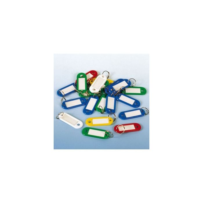 Nøgleringe Fleksibel plast med gennemsigtigt vindue (3,4 x 1,5 cm), metalring og hvid label. 5,6 x 2,2 cm Pakket med 100 stk. Assorterede farver