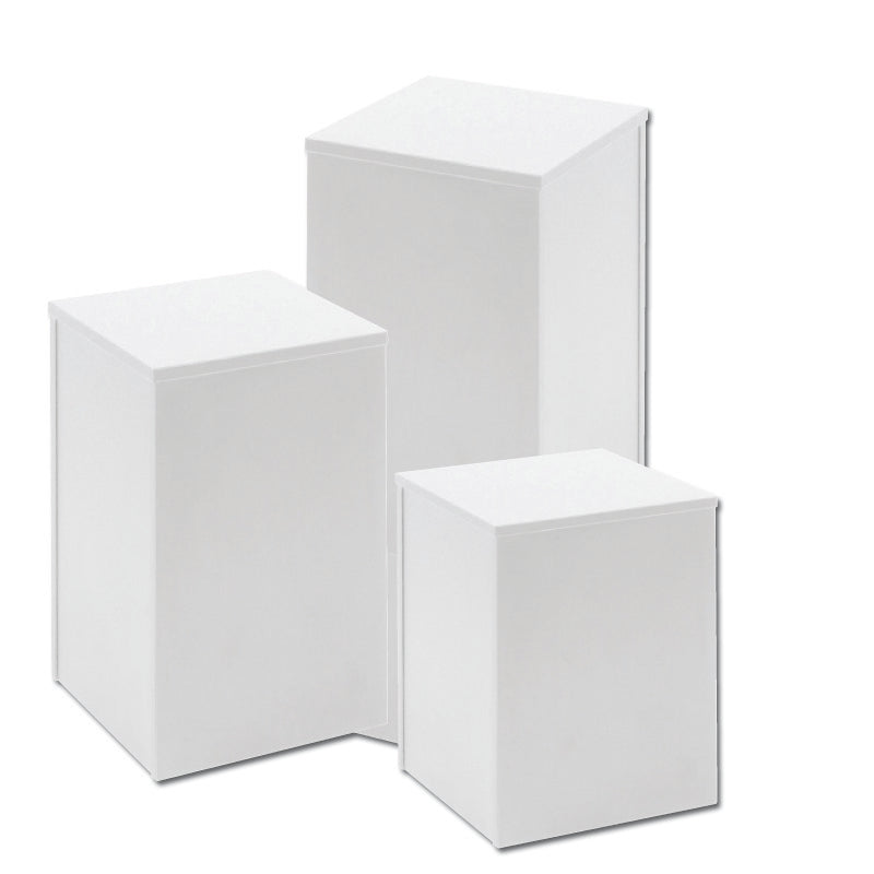 Sæt med tre podier i hvid,. Designet i holdbart melamin. Hver podie har en maksimal belastning på 50 kg. Sættet leveres usamlet, og prisen inkluderer alle tre podier. Perfekt til fremvisning af produkter eller. Dekorationer i ethvert rum. Mål:40 x 40 x H100 cm, 40 x 40 x H75 cm og 40 x 40 x H50 cm. Hvid melamin. Prisen er for et sæt med 3 podier. Sættet fås også sort