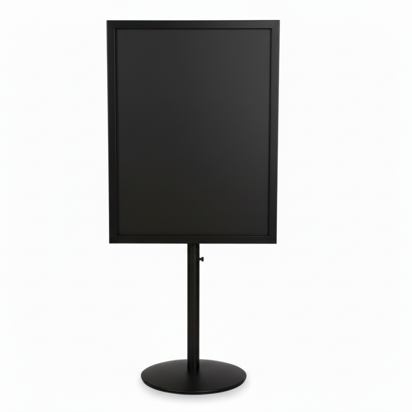 Vores klassiske menukortholder i metal på en solid rund metalfod. Vores menu- eller skilteholder er velegnet til enhver form for skiltning. Uanset om det er lamineret skilt, skilt med plastlommer, papir eller pap, kan det indsættes i vores menukortholder. Foden har en fast højde på 19 cm, men den kan forhøjes med op til 15 cm ved tilkøb af en forlænger. Vi anbefaler også at tilkøbe plastlommer til at beskytte papirskiltet mod slid og snavs. Den galvaniserede model er særligt velegnet til udendørs salgsborde, hvor den tåler forskellige vejrforhold.