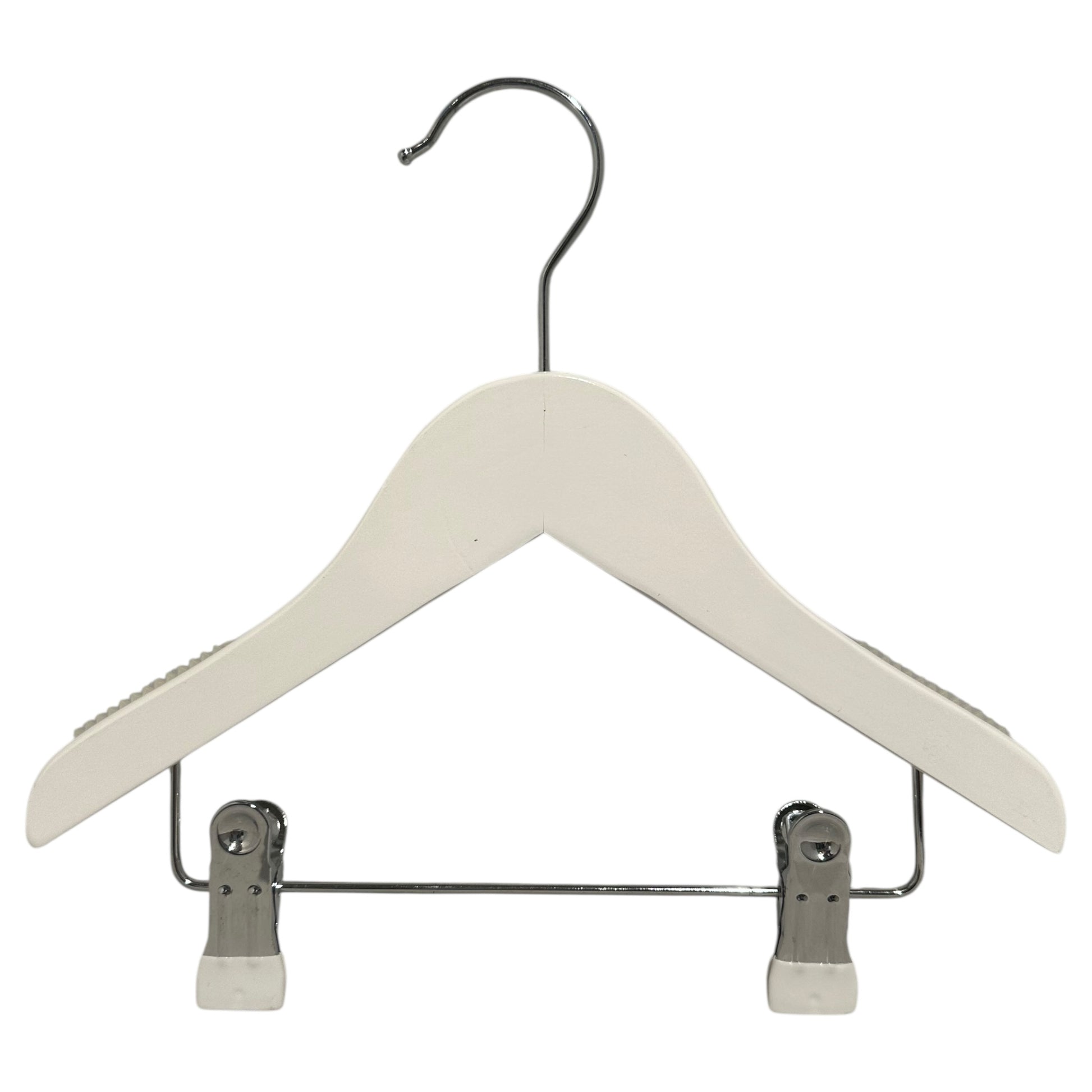 Træbøjle, massiv, flad, baby, med klemme, hvid, 27 cm