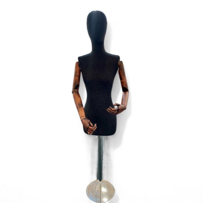 Vintage dame-figur med torso og hoved i sort stof. Hovedet kan drejes og tages af. Figuren har mørkebrune træarme. Rund metalfod i krom