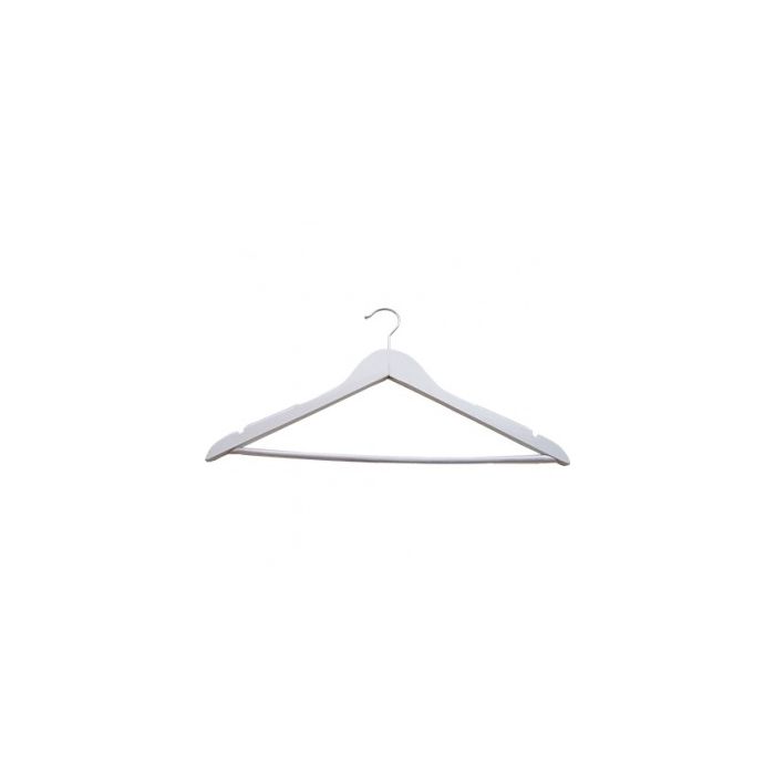 Træbøjle, massiv, flad, voksen, med gummi og hak, med stang, blank hvid, 12 mm tyk, 45 cm er til rådighed til at købe i intervaller af 50