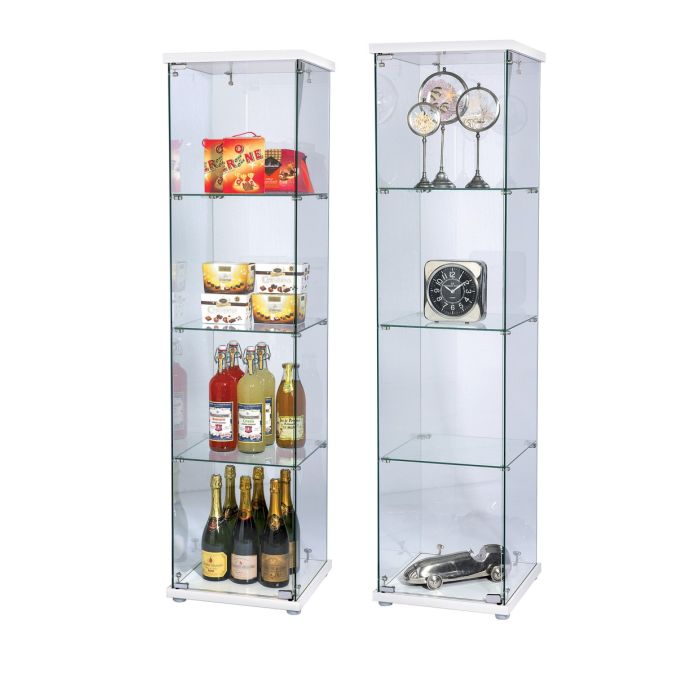 Valence I gulvvitrine lavet i hærdet glas med 4 faste glashylder og Hvid melamin bund og glas top.